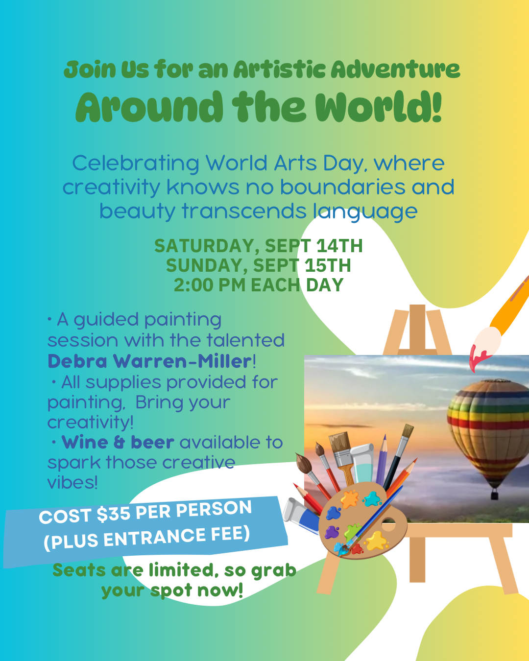 - Paint session with Debra Warren-Miller: Saturday and Sunday from 2pm to 4pm each day